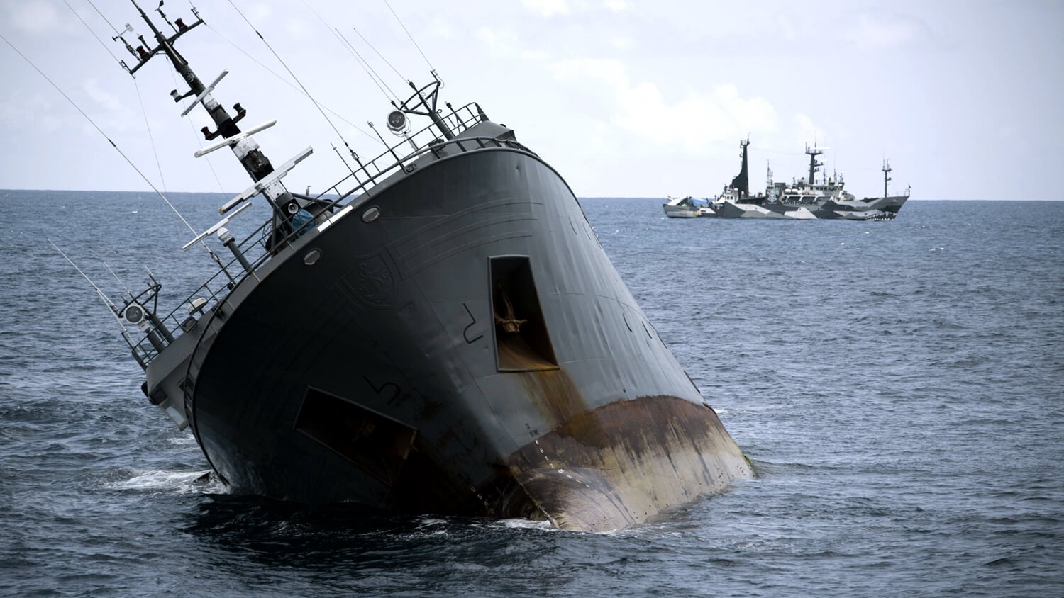 The sinking Thunder issues a distress signal, and the Bob Barker immediately launches a rescue operation. The Thunder sinks at 0˚ 20' North 05˚ 23' East inside the Exclusive Economic Zone (EEZ) of Sao Tome, while the Bob Barker and Sam Simon help all 40 crew members of the poaching vessels to safety.