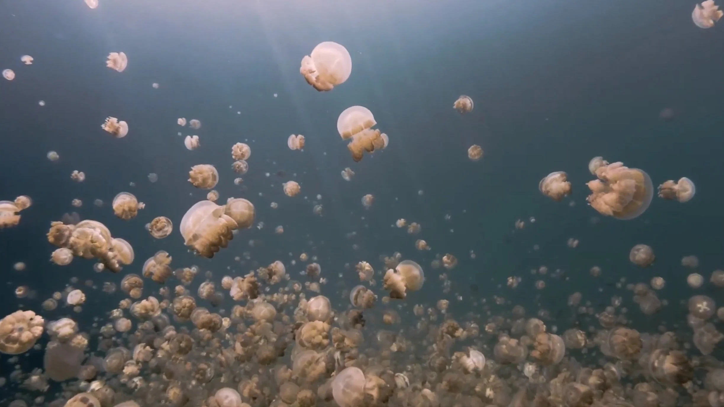This is Ongeim'l Tketau lake in Palau – home to millions of harmless golden jellyfish. Every day, as dawn breaks over the Western Pacific, this miniature galaxy of marine life begins a unique migration in search of the sun.