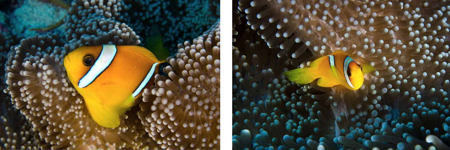 Anchored to rocks and coral, sea anemones feed and defend themselves with stinging ‘nematocysts’ on their tentacles, which are deadly to marine life and even, in some species, to humans. The exact mechanism that allows clownfish to swim in and among them unharmed hasn’t been fully pinned down, but its thought clownfish adapt individually to anemones by gradually coating themselves in a layer of mucus that makes them immune to stings.