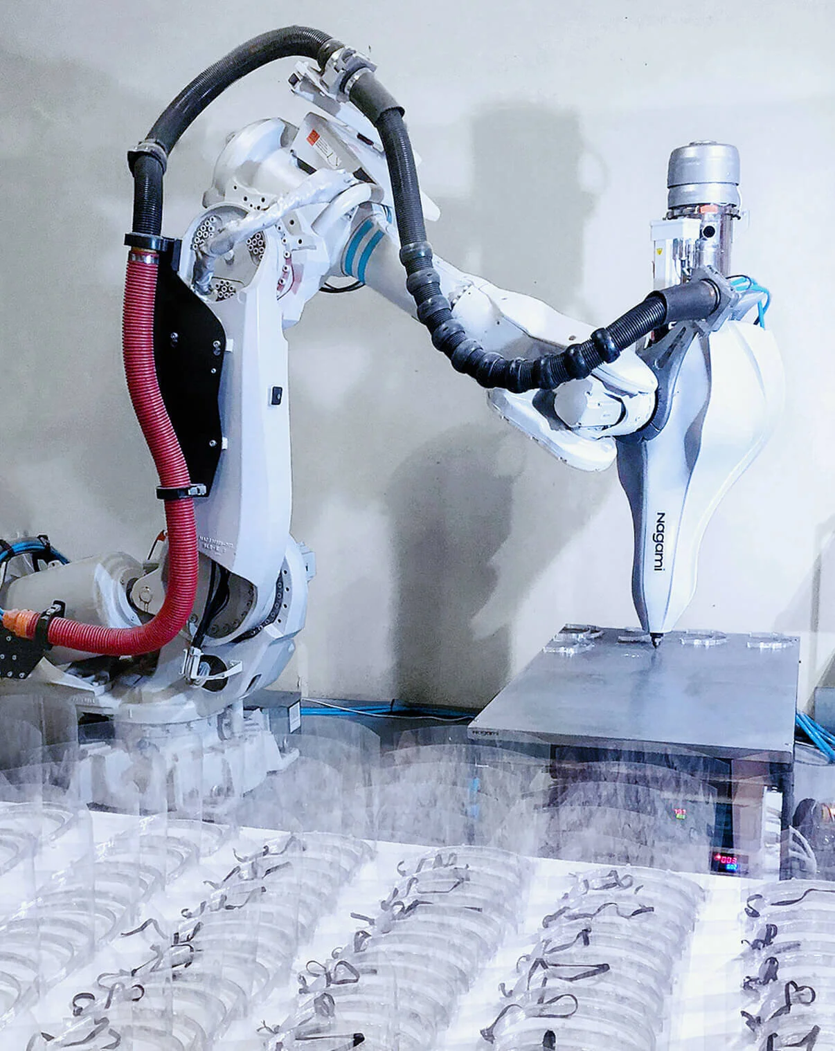 The shields are produced through robotic extrusion in a layer-by-layer FDM (fused deposition modelling) process. Both the initial batch (produced with recycled PETG) and the new Ocean Plastic® versions are durable, tough, 100% recyclable, and feature robust chemical resistance and high-impact strength.