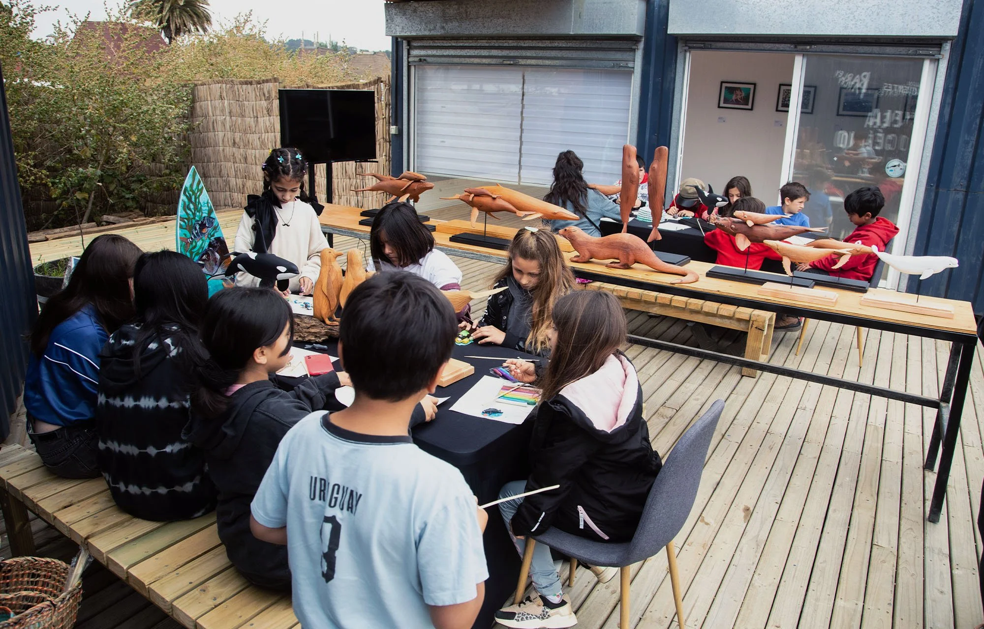Just steps from the beach here, the Escuela del Océano has been welcoming surfers, students, scientists, artists, visitors and local residents for two years now. A joint venture between Parley Chile and the local Fundación Rompientes, the waterfront space is built from modular shipping containers like our other Parley AIR Stations, and brings people together around ocean education and action. Since 2024, more than 2,300 people have visited, including over 1,000 students. Our team has run 90 workshops, hosted 40 school visits, and organized 46 beach cleanups, removing over 9,000 kilograms of waste in the process. More than 1,200 volunteers have taken part, and the initiative has helped generate 100 local jobs along the way.