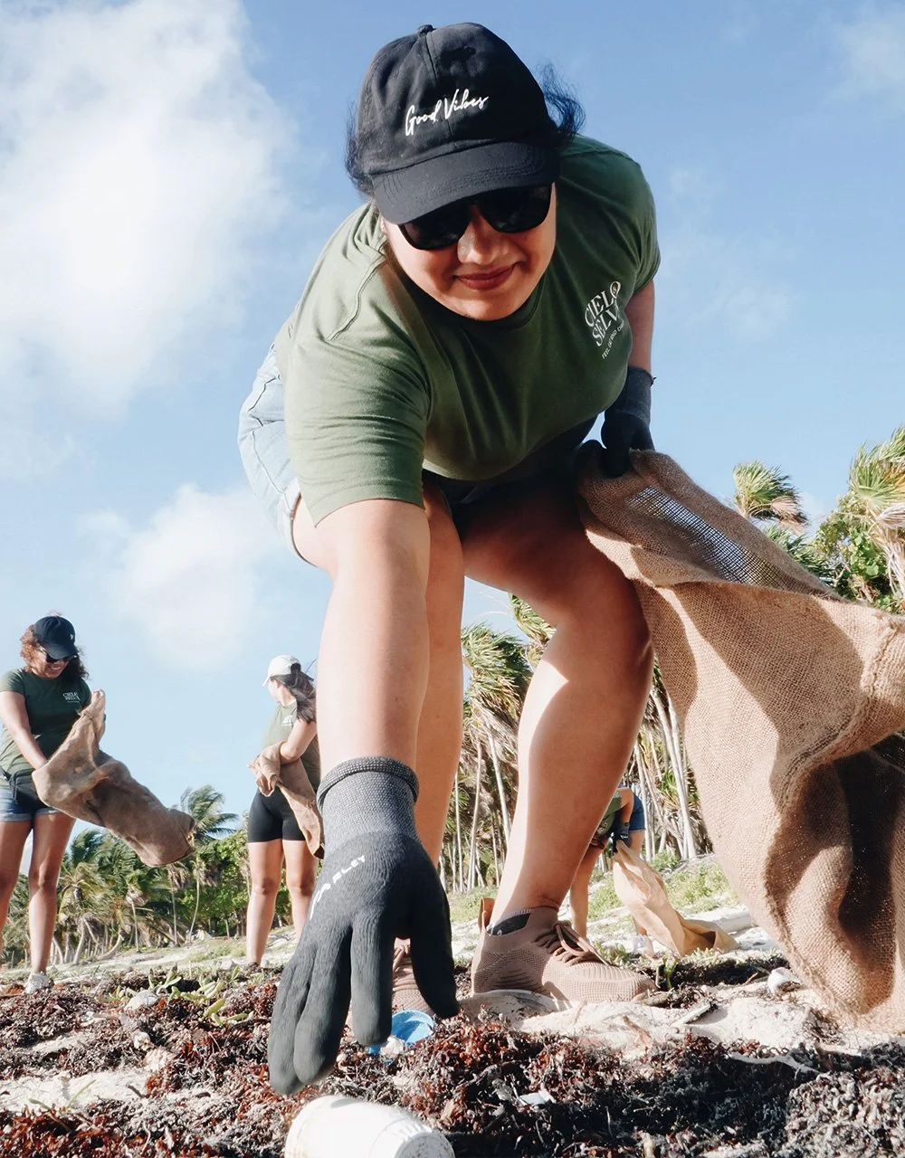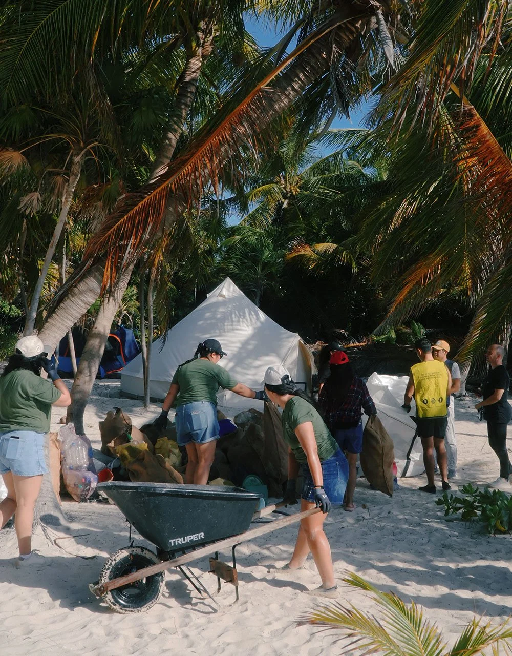 To get there, our truck loaded with Parley cleanup gear winds its way down an unpaved and heavily-cratered dirt road, which occasionally turns into a gleaming, slippery sand track. We pass a few sun-faded hotels and fenced-off ranches after leaving Tulum and entering the park, but it still feels far more wild and undeveloped than the coastline further north. As we bump, rock and sway side-to-side making our way slowly south, Parley México’s Ximena Arvizu tells me the team has been organizing cleanups here because of the area’s biodiversity, local communities and susceptibility to drifting plastic pollution.
