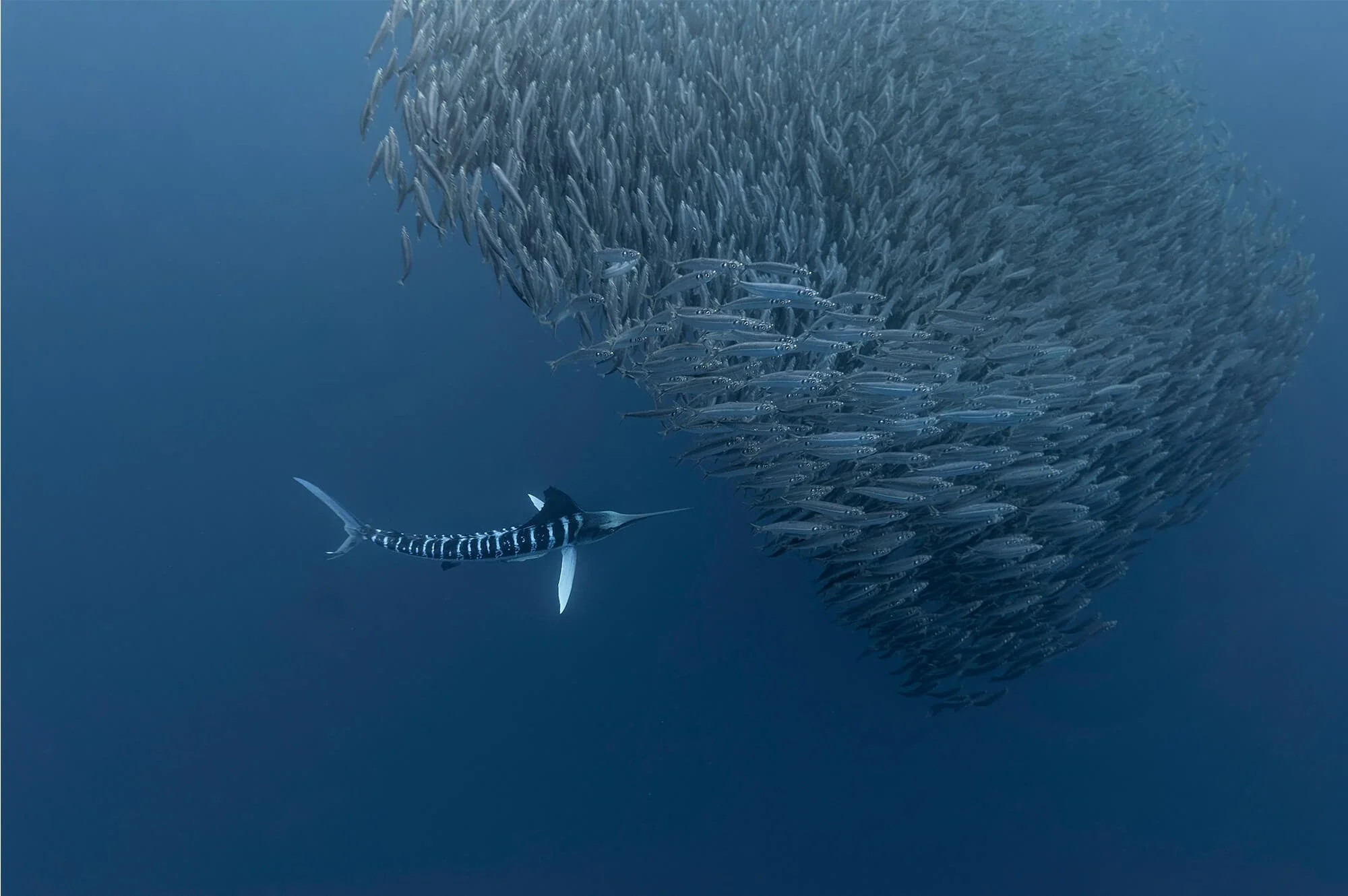 And marlins working baitballs in Baja? That’s pure kinetic energy. The dance, the power, the speed. The way the baitballs move and shift, creating these dynamic shapes through emergent behavior from simple rules. It’s like witnessing the ocean’s choreography unfold in real time. What connects all of these for me is that they’re windows into different ways of experiencing the world – each creature’s unique umwelt, their sensory reality that’s so different from ours. That’s what I’m trying to capture and share.